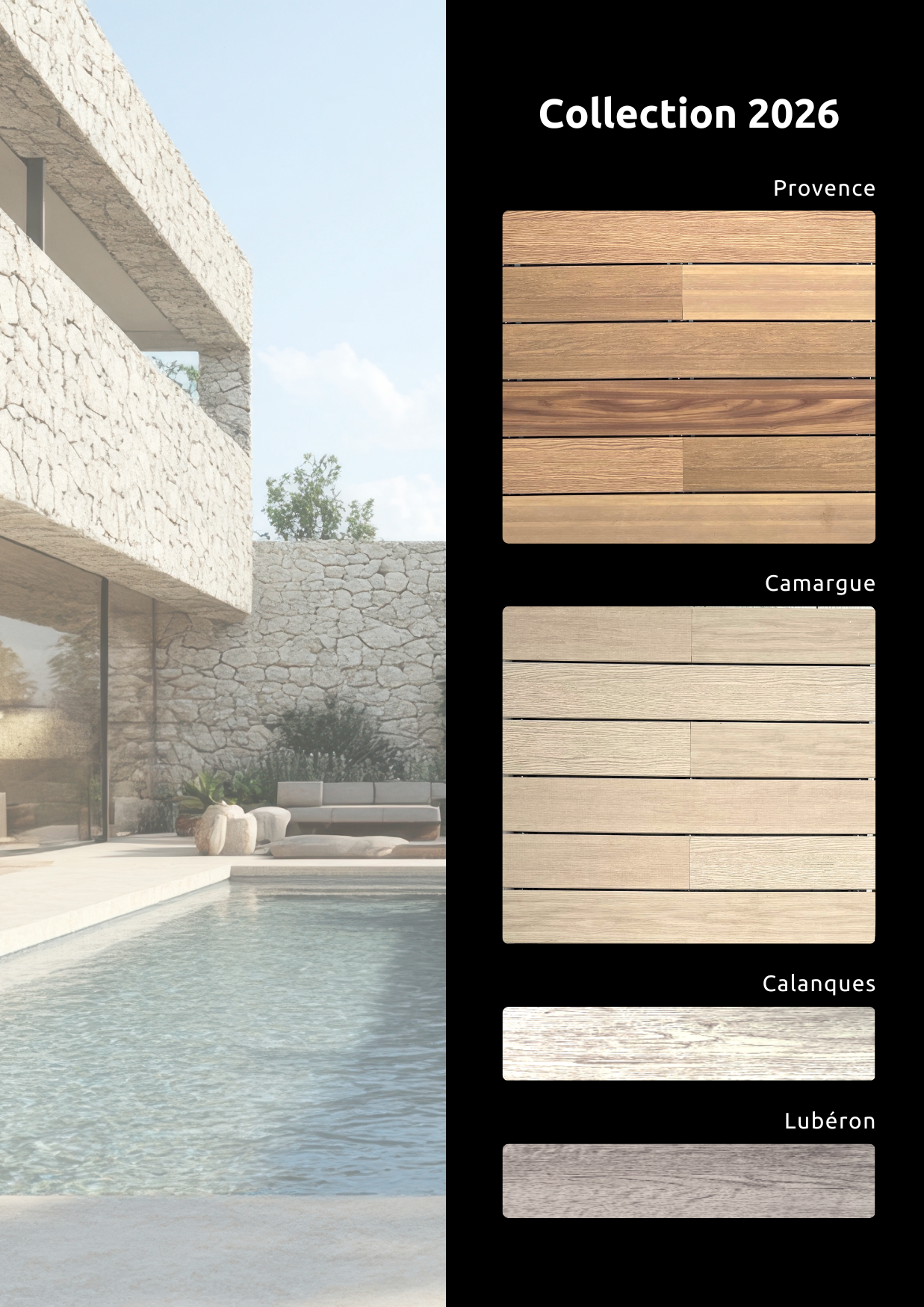 Choisissez parmi les aspects bois, celui qui sera le plus en harmonie avec votre design extérieur, qui mettra le plus en valeur votre piscine ou votre mobilier, la végétation ou la façade de votre habitation.